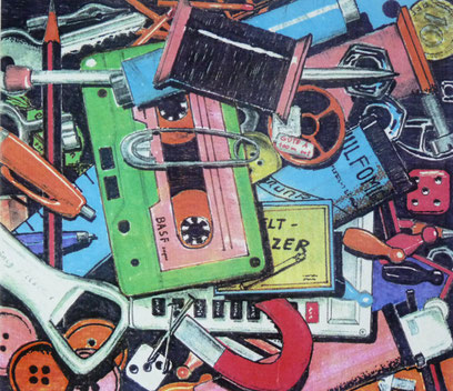 Dieses Bild habe ich 1987 auf meine Schreibtischunterlage an meinem Arbeitsplatz beim Elektor-Verlag in Aachen gezeichnet. Jedes Mal, wenn ich telefonierte, habe ich es ein wenig erweitert. Gezeichnet wurde es mit Filzstiften, Markern und allem, was ich sonst noch gerade in die Finger bekam. Das Original habe ich leider verloren, aber zum Glück konnte ich vorher noch ein paar Farbfotokopien anfertigen.