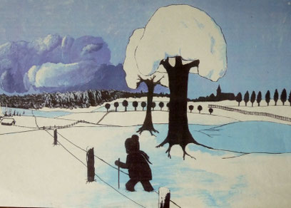 Die etwas triste Stimmung in diesem mit Plakafarben gemalten Bild resultiert aus der Tatsache, dass es zu einem Zeitpunkt entstand, als ich gerade von Saarbrücken nach Aachen gezogen war und oft Heimweh hatte. Beim Zeichnen der Landschaft wurde ich von den Feldern um die nahegelegene, belgische Gemeinde Raeren inspiriert, wo einer der ersten Freunde, die ich damals kennenlernte, wohnte, der mich am Wochenende öfter zu sich einlud. Ich bin ihm nachträglich noch sehr dankbar dafür.