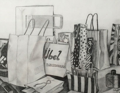 In unseren VHS Zeichenkursen bekamen wir immer wieder neue Übungsaufgaben gestellt. Hier das Thema: Einkaufstüten. Eine echte Herausforderung.