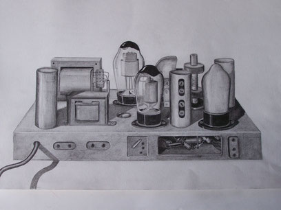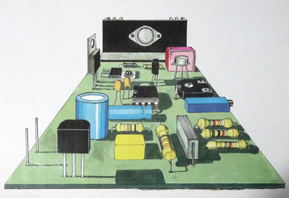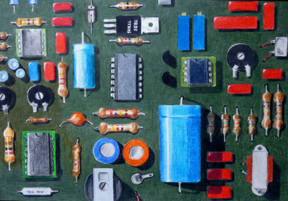 Einmal bekam ich zu Weihnachten von meiner Freundin teure Farbstifte geschenkt, die ich natürlich gleich ausprobierte. Hier der Versuch, das Thema Elektronik ein wenig künstlerisch zu verfremden.