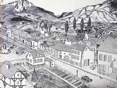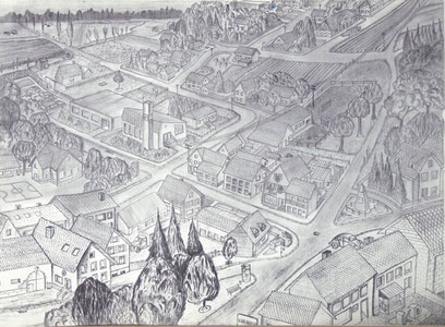 Bleistift und dargestellt aus einer fiktiven Vogelperspektive. In diesem schönen Dorf habe ich von 1982 bis 1985 bei einer guten Kollegin zur Untermiete gewohnt. Eine schöne und erlebnisreiche