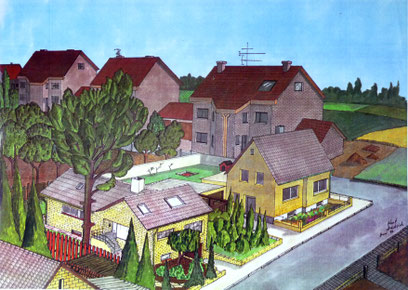 In dieses Haus in Baal bei Hückelhoven bin ich 1988 mit Familie eingezogen (unten links im Vordergund das Haus mit den beiden versetzten Dächern). Ein wunderschönes Haus, in dem ich mich sehr wohl gefühlt habe und das ich aus bestimmten Gründen im Jahre 1996 leider wieder verkaufen musste. Das Haus ist im Vergleich zum Nachbarhaus beim Zeichnen leider etwas zu klein ausgefallen. Eigentlich soltte es um etwa das Eineinhalbfache größer dargestellt sein. Auch hier waren wieder die Pantone-Stifte am Werk.