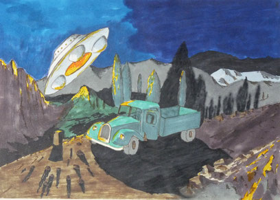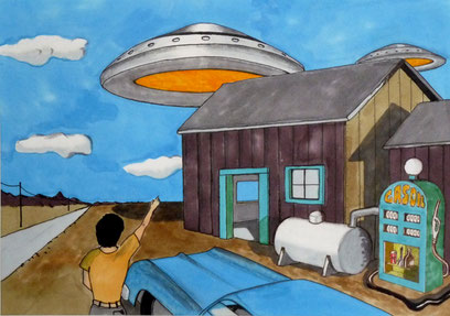 Da ich mich immer schon für UFOs interessierte, konnte ich mir irgendwann nicht verkneifen, auch einmal ein Bild mit einem UFO zu zeichnen. Es ist zwar reine Phantasie, aber ich könnte mir vorstellen, dass es solche Situationen durchaus schon mal gegeben hat. Natürlich spielt die Szene in den USA - wo sonst!