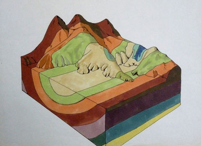 Als Geologe ist es natürlich Ehrensache, auch dieses Thema zeichnerisch umzusetzen. Hier ein mit Pantone-Stiften gezeichnetes Bild, das die geologischen Schichten eines Gebietes dreidimensional darstellt.