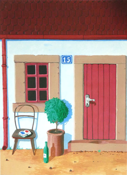 Diese Fassade existiert nur in meiner Phantasie. Das Bild habe ich im Jahre 2001 mit Plaka-Farben gemalt. Das nasskalte und graue Wetter erweckte in mir die Sehnsucht nach dem sonnigen Mittelmeer. Ein Haus wie dieses könnte ich mir zum Beispiel in Griechenland gut vorstellen.