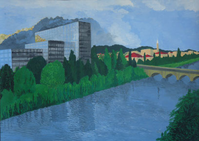 Dieses mit Plaka-Farben gemalte Bild (DIN A 2) entstand im Rahmen des Projektes "Stadtrausch", das wir in der Samstags-Gruppe von Frau Zantis durchführten. Die dabei entstandenen Bilder wurden im Museum Zinkhütter Hof in Stolberg ausgestellt.
